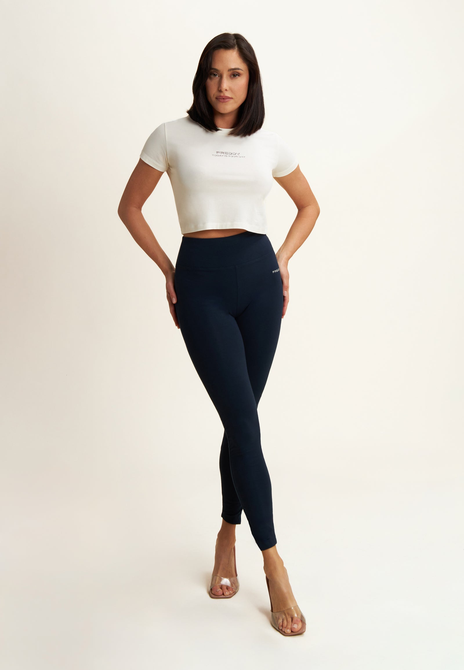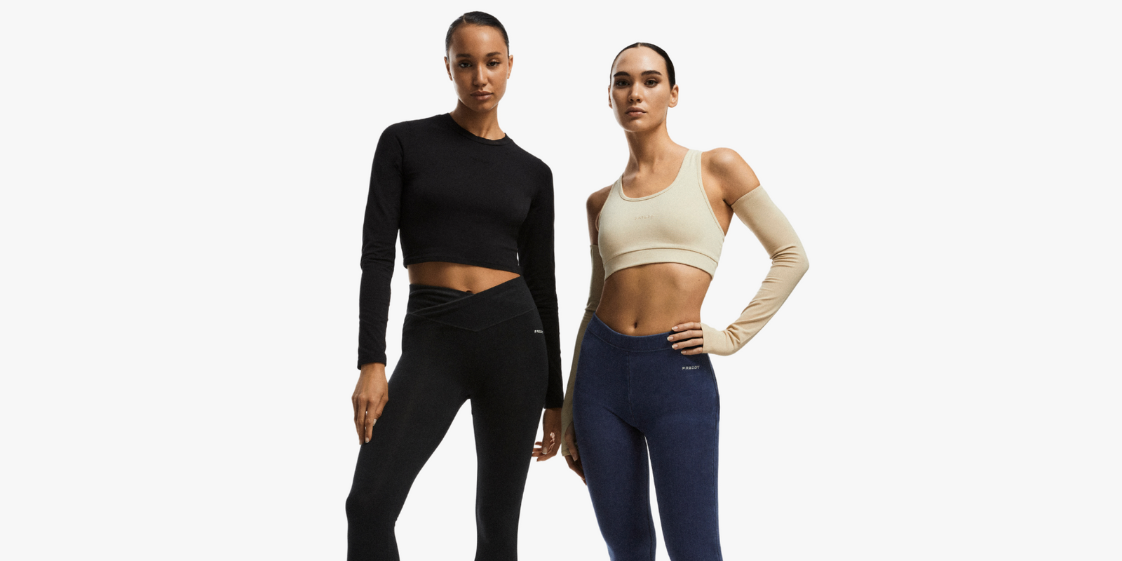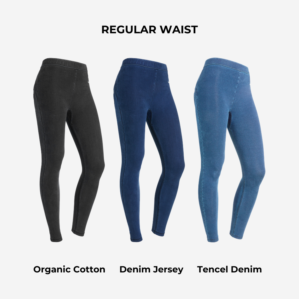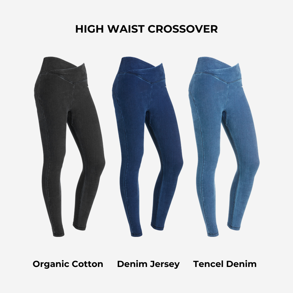 The WR.UP® CORE leggings are available in "Regular Waist" and "High Crossover Waist" versions. Each model is also available in three different fabrics: Organic Cotton, Denim Jersey and Tencel Denim.