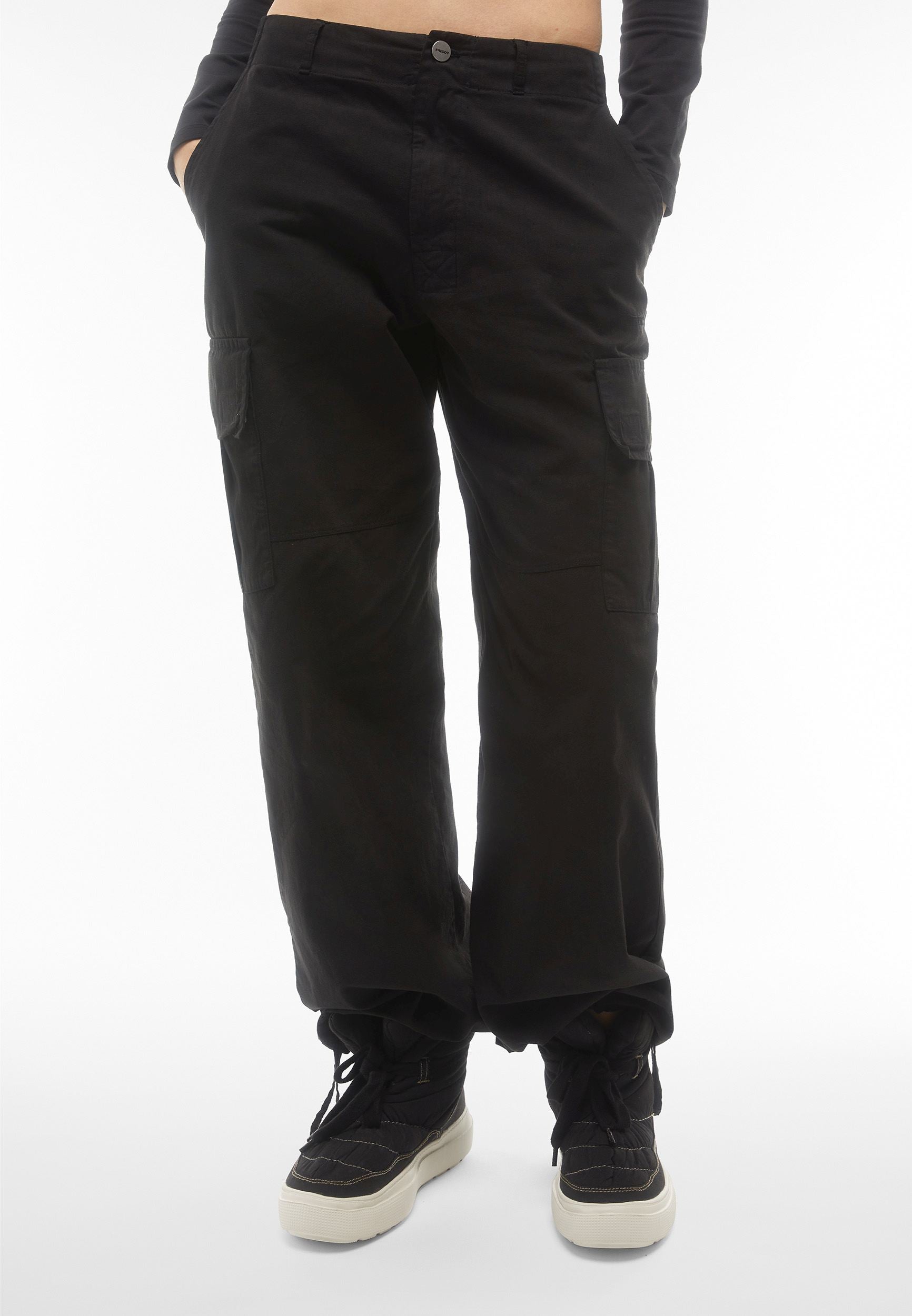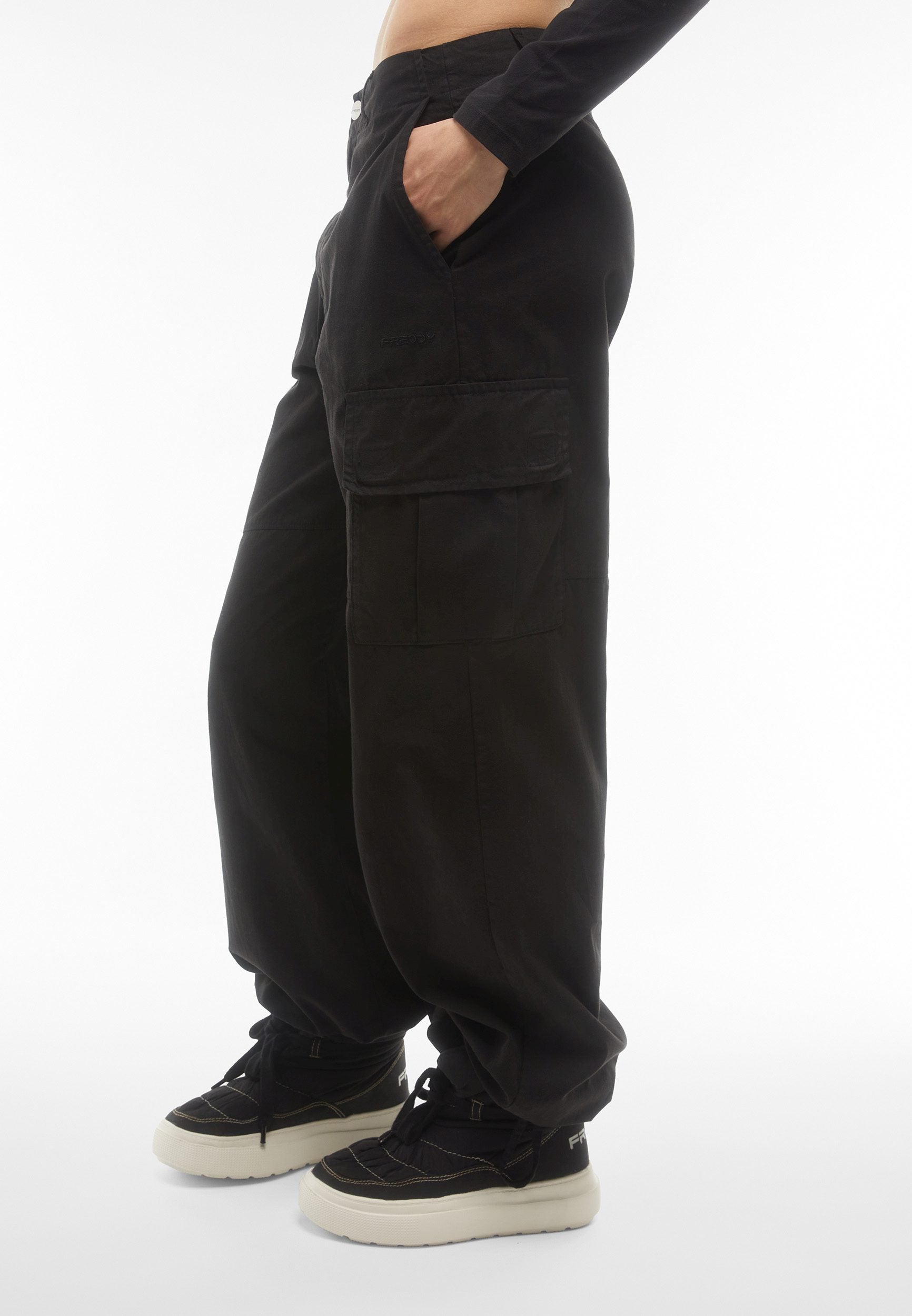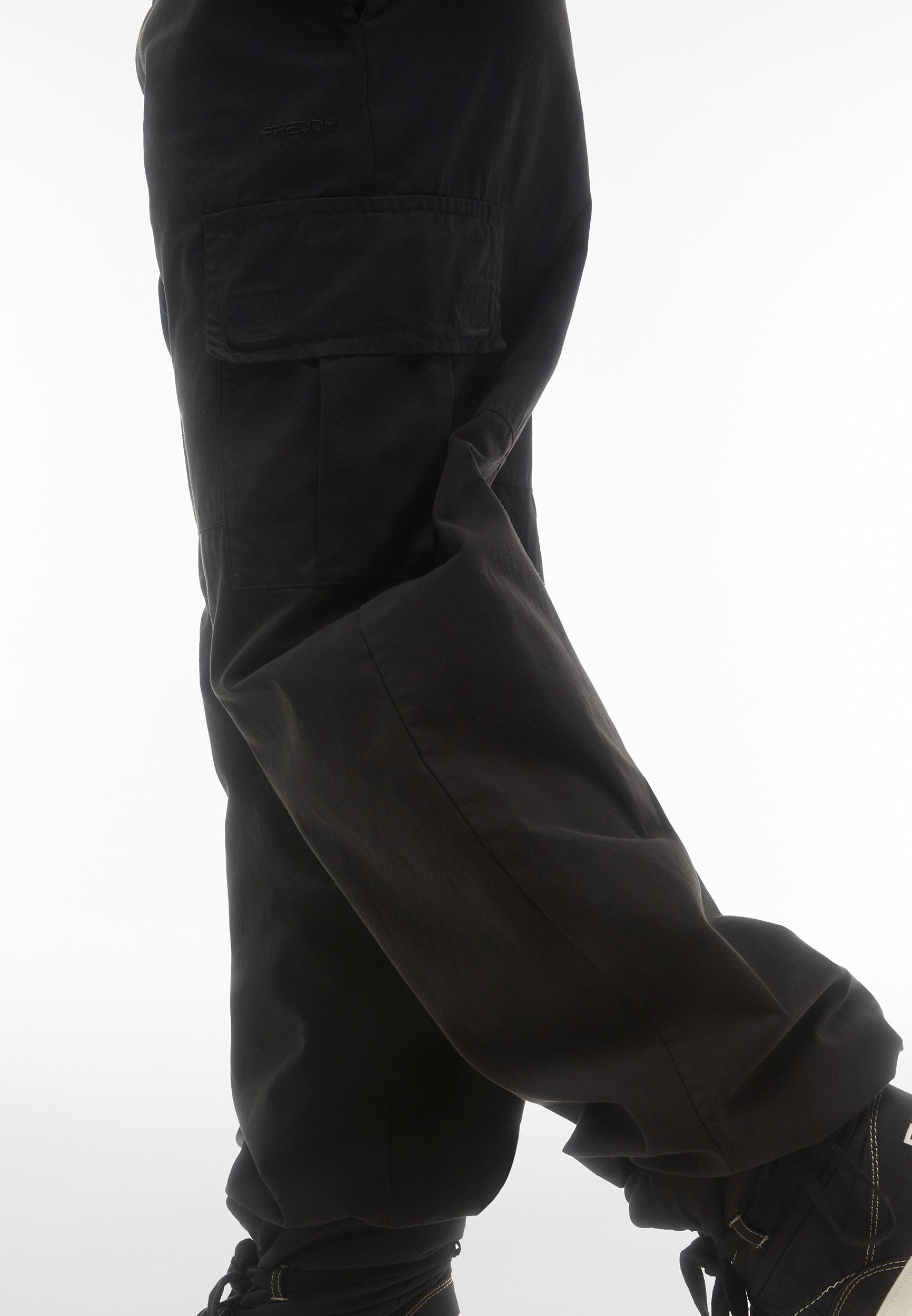 Avec ce pantalon cargo au design classique avec ses poches latérales à soufflet et un cordon de serrage pour ajuster l'ourlet, tu crées un look parfait dans le style des années 90. La toile teinte en pièce en coton écologique pour un aspect légèrement usé confère à ce pantalon un style workwear raffiné. Le modèle est doté d'une fermeture à boutons et à glissière, de passants de ceinture à la taille et de poches françaises sur le devant ainsi que de poches latérales avec fermeture velcro. Les deux cordons de serrage à l'ourlet permettent d'ajuster la longueur et la coupe. Le petit logo Freddy brodé au-dessus de la grande poche gauche est un détail élégant qui complète l'ensemble.