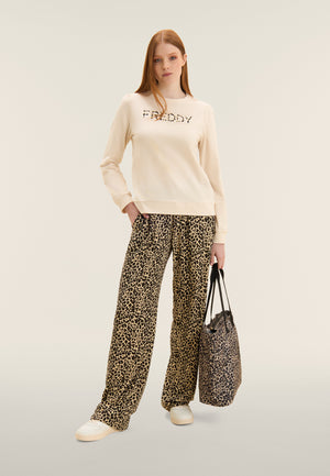 Weite, Leichtigkeit und Temperament: Diese Hose mit weitem Bein verbindet den Komfort einer lockeren Passform mit der Persönlichkeit des Animal-Prints. Sie ist aus fliessender, leichter Viskose gefertigt und verfügt über einen normalen Bund mit innenliegendem Kordelzug, Pattentaschen und eine goldene FREDDY-Plakette auf der linken Tasche. Ein Kleidungsstück, das nicht unbemerkt bleibt und perfekt ist, um auch Ihrer Freizeit Charakter zu verleihen.