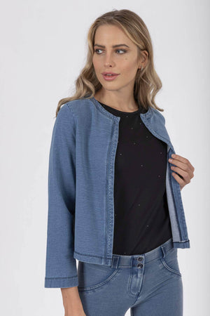 Veste en tissu sweatshirt effet denim sans fermeture et avec bordure en microrivets. Taille normale, manches rondes et encolure ronde sans col. Son design minimaliste, enrichi par le détail lumineux des rivets, s'allie au confort et à la flexibilité du tissu et confère au vêtement une grande polyvalence dans les combinaisons possibles.