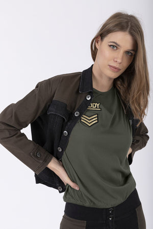 Veste en denim avec des empiècements en vert militaire avec une coupe confortable, avec fermeture à boutons. Avec un ourlet et des manches droites et un col chemise. Le style casual intemporel de la veste en jean classique semble unique grâce au jeu des empiècements en vert militaire qui lui confèrent un caractère particulier. Un vêtement confortable, facile à porter et adapté pour compléter toutes tes tenues avec personnalité et style.