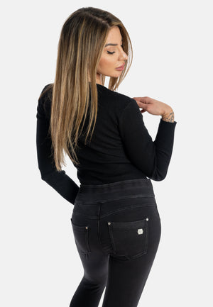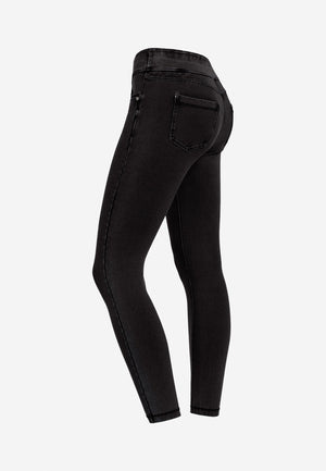 Caractéristiques : Ceinture moyenne | Forme superskinny | Longueur 7/8 | Ceinture sans fermeture éclair ni boutons | Camée métallique avec strass sur la poche arrière | Tissu jersey stretch bio denim | Lavage pour un léger effet d'usure