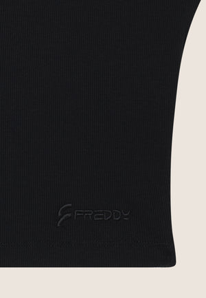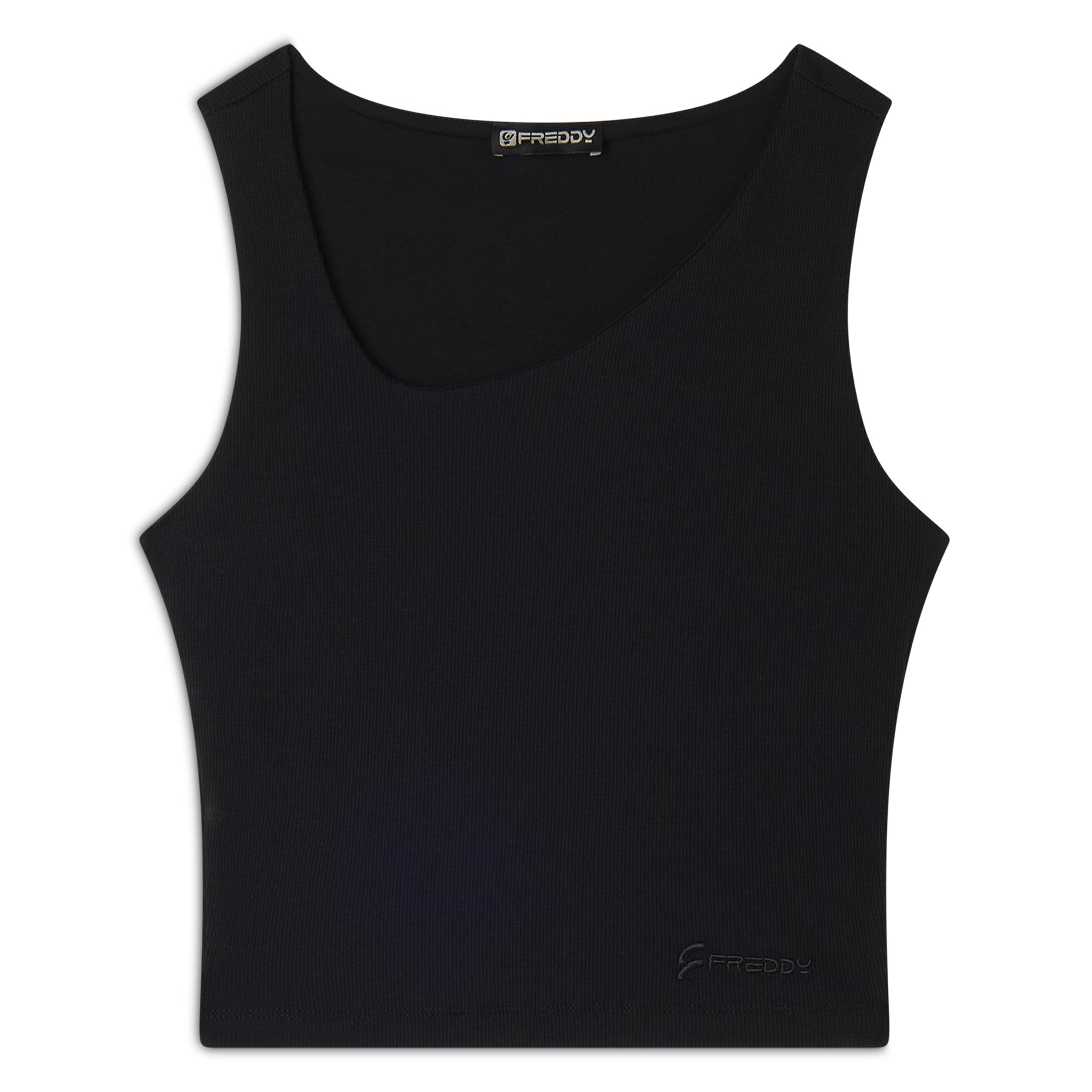 Top court avec une coupe étroite qui flatte la silhouette. Il est confectionné en coton stretch côtelé et offre un confort sans compromis. L'encolure asymétrique raffinée et les larges bretelles sont idéales pour un look original et féminin. L'intemporel logo Freddy brodé sur l'ourlet ajoute une touche d'élégance au vêtement. Parfait pour les tenues chic et décontractées ou pour donner du caractère à un look basique.