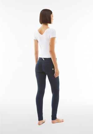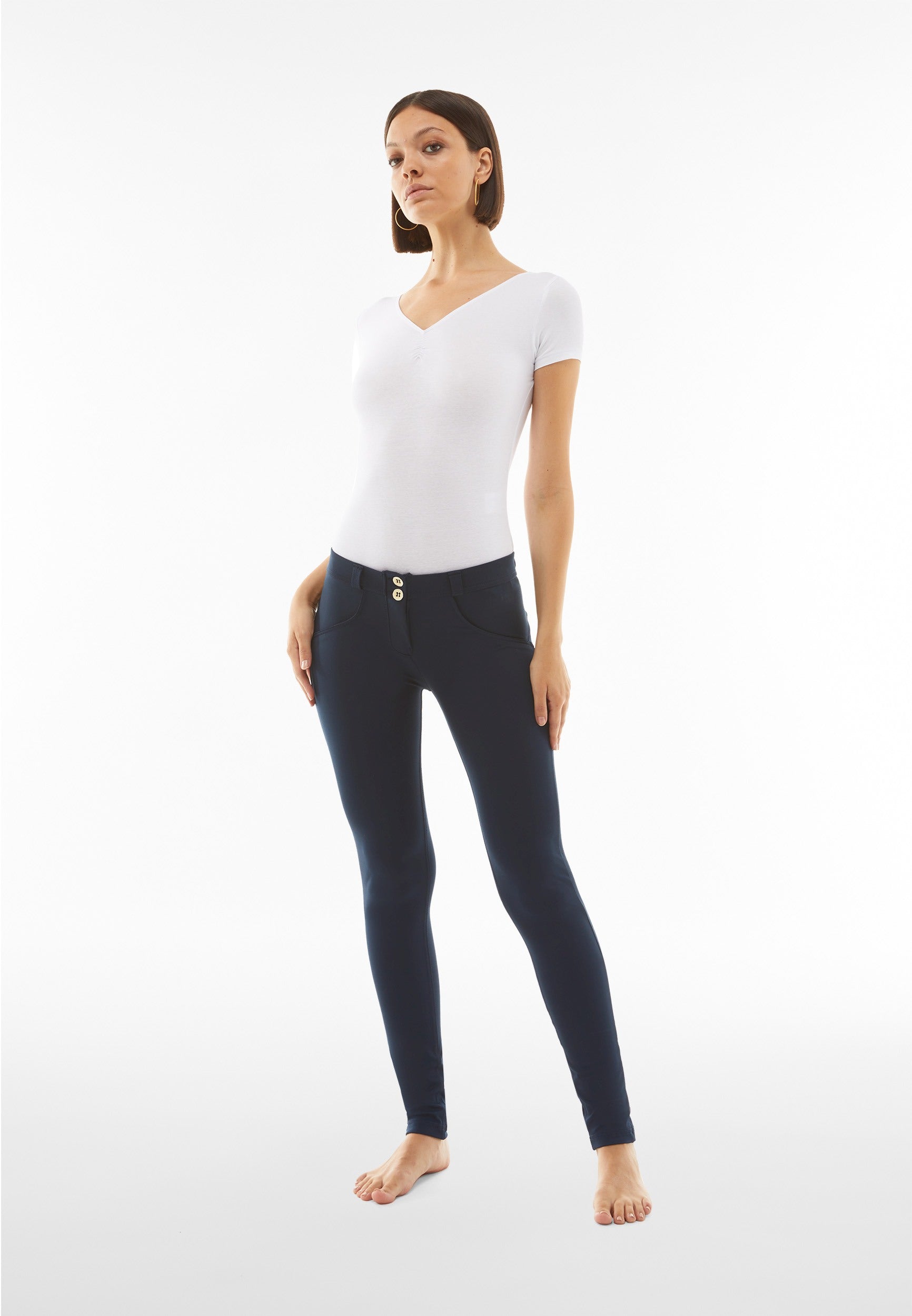 Push-up-Hose aus der WR.UP®-Linie aus nachhaltigem atmungsaktivem Technostoff, die deine Schönheit bei jeder Gelegenheit unterstreicht. Das Modell hat einen normalen Taillenbund mit Zweiknopf-Verschluss, normale Länge und Skinny-Passform für ein angenehmes Anschmiegen an die Körperlinien. Ein Kleidungsstück, das deine Weiblichkeit mit höchstem Komfort unterstreicht, dank der exklusiven, von Freddy patentierten WR.UP®-Technologie, die durch ein spezielles System von Einsätzen und Nähten einen angenehmen Formungs- und Hebeeffekt erzielt, und dem innovativen D.I.W.O.®-Recyclingstoff, der aus Plastikflaschen gewonnen und in eine neue Faser umgewandelt wird, die mehr Atmungsaktivität bietet und die Thermoregulierung der Haut fördert.