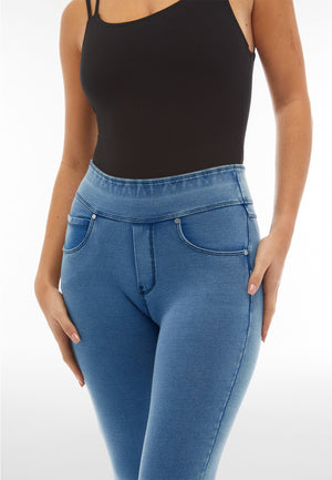 Eigenschaften: Mittlerer Taillenbund | Superskinny-Passform | 7/8 Länge | Bund ohne Reissverschluss und Knöpfe | Metallische Kamee mit Strasssteinen auf der Gesässtasche | Bio Denim Stretch-Jersey-Stoff | Waschung für einen leichten Abnutzungseffekt