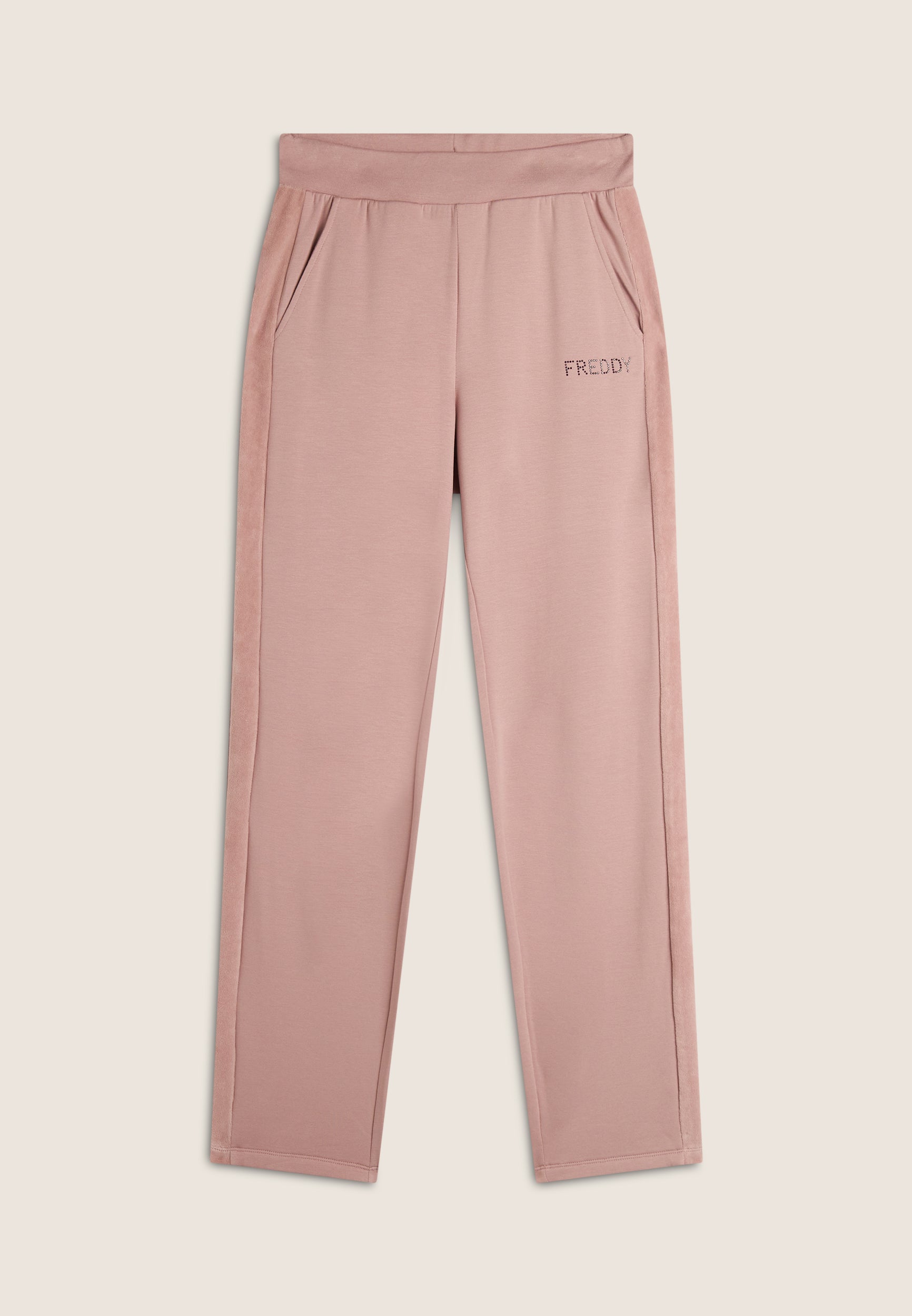 Erlebe die perfekte Kombination aus Komfort und Stil mit der Regular Fit langen Hose aus Stretch-Viskose-Sweatshirtstoff, die für ihre Weichheit und ihren Glanz geschätzt wird. Seitliche Bänder aus Samt betonen die Länge und das kleine FREDDY-Logo aus Strasssteinen an der linken Hüfte verleiht einen raffinierten Look. Französische Taschen und ein gerippter normaler Taillenbund mit Kordelzug auf der Innenseite sorgen für eine tadellose Passform, während der gerade Bund einen Hauch von Klasse verleiht.