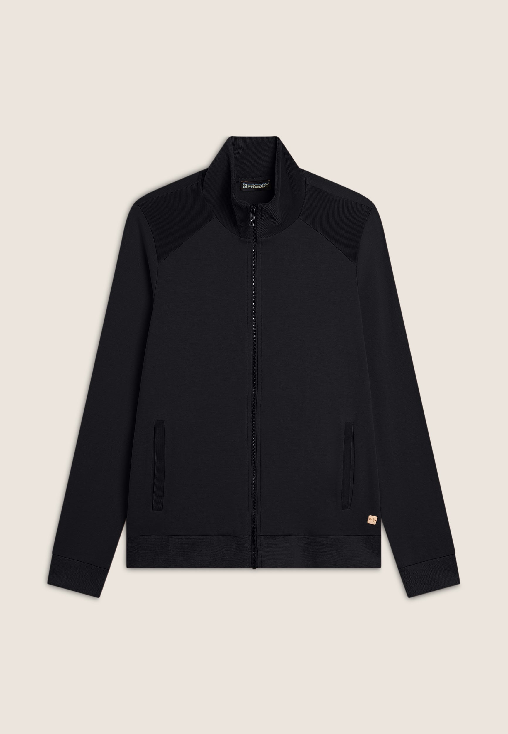 Dieses Damen-Sweatshirt mit normaler Passform aus warmem Viskose-Mullfleece verbindet Komfort und Stil. Der milleraies Samtkragen, die Schultern und die Tascheneingriffe verleihen ihm einen eleganten Touch. Das applizierte Logo auf der linken Seite, die Leistentaschen und der hohe Kragen vervollständigen das Design. Reissverschluss in Roségold und Ärmel mit Bündchen.