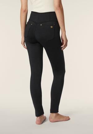 Entdecken Sie das perfekte Gleichgewicht zwischen Komfort, Technologie und Nachhaltigkeit mit unserer hoch taillierten Skinny-Hose in normaler Länge. Die Hose ist aus dem von Freddy patentierten D.I.W.O.® Brushed-Gewebe gefertigt, das die Transpiration der Haut begünstigt und Sie den ganzen Tag über kühl und bequem hält.Das D.I.W.O.® Brushed-Gewebe besteht aus Polyester, das aus Fasern gewonnen wird, die aus dem Recycling von Plastikflaschen stammen, was diese Hose zu einer ökologischen und verantwortungsvollen Wahl macht. Die gebürstete Behandlung verleiht dem Stoff eine aussergewöhnliche Weichheit und Wärme, ideal für die kühleren Jahreszeiten. Das schlanke Design zeichnet sich durch eine figurschmeichelnde zentrale Beinnaht und einen sauberen, raffinierten Look aus, da es keine Vordertaschen gibt.
