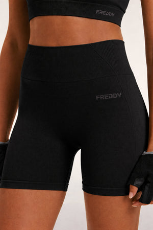 Diese nahtlosen kurzen Leggings sind für eine perfekte Passform beim Sport konzipiert. Der hohe Bund mit Rippstrickbündchen bietet Halt und Komfort, während die Rippstrick-Einsätze auf der Rückseite die weiblichen Kurven sanft formen und stützen. Das FREDDY-Logo auf der Vorderseite und das ikonische "omino" auf der Rückseite runden das sportliche und dynamische Design ab. Ein ideales Kleidungsstück für alle, die beim Sport Stil und Funktionalität suchen.