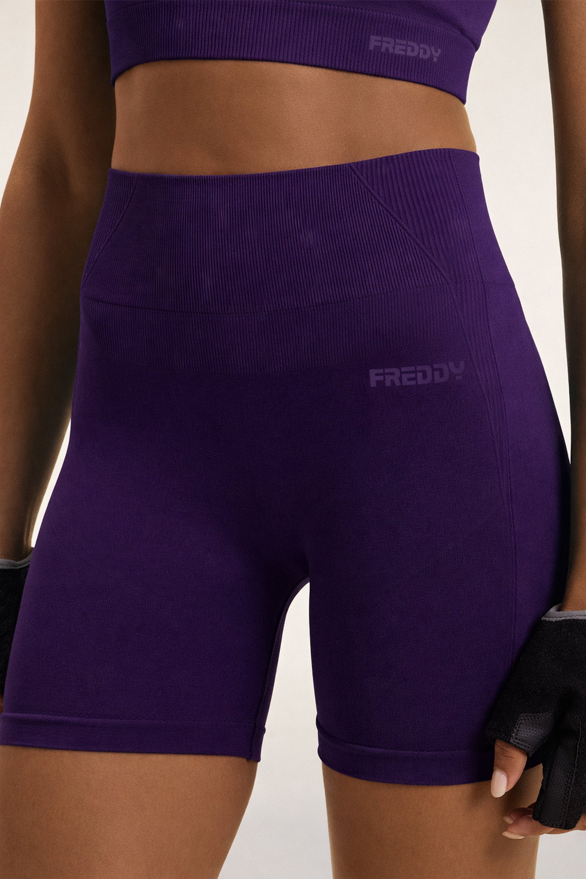 Diese nahtlosen kurzen Leggings sind für eine perfekte Passform beim Sport konzipiert. Der hohe Bund mit Rippstrickbündchen bietet Halt und Komfort, während die Rippstrick-Einsätze auf der Rückseite die weiblichen Kurven sanft formen und stützen. Das FREDDY-Logo auf der Vorderseite und das ikonische "omino" auf der Rückseite runden das sportliche und dynamische Design ab. Ein ideales Kleidungsstück für alle, die beim Sport Stil und Funktionalität suchen.