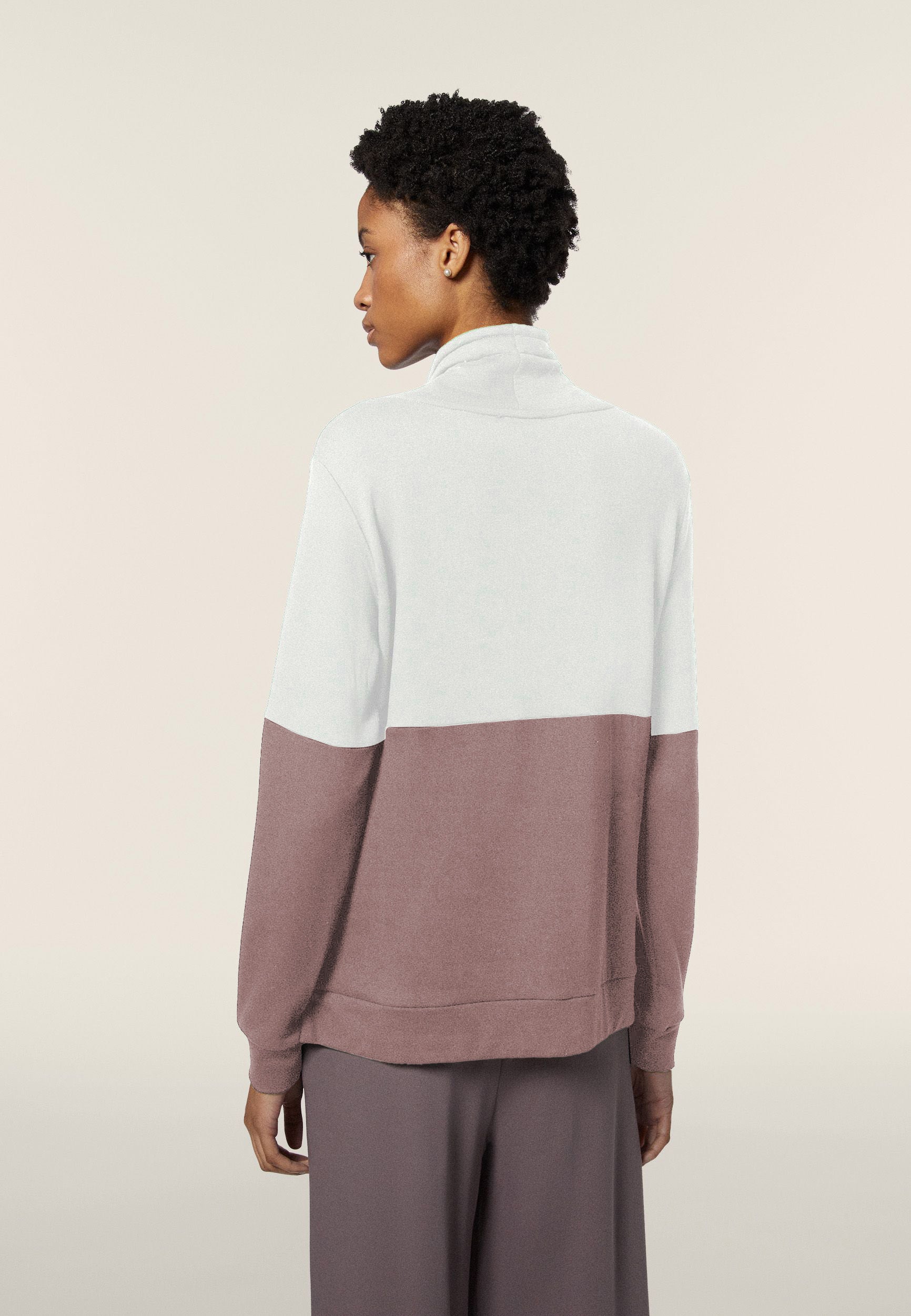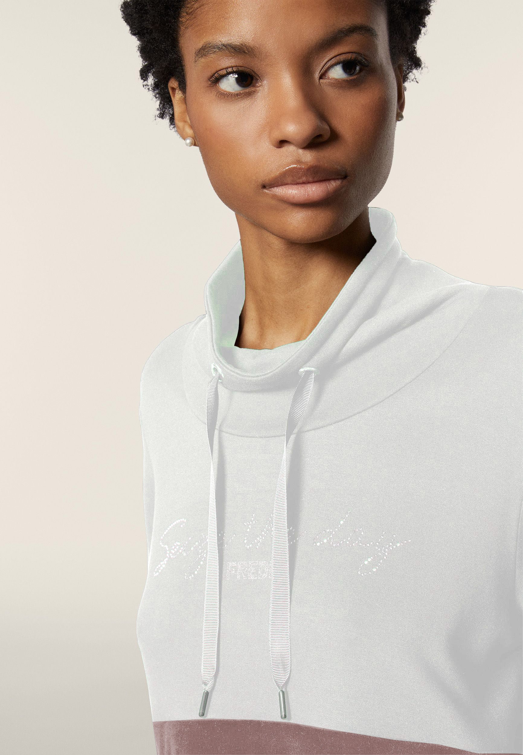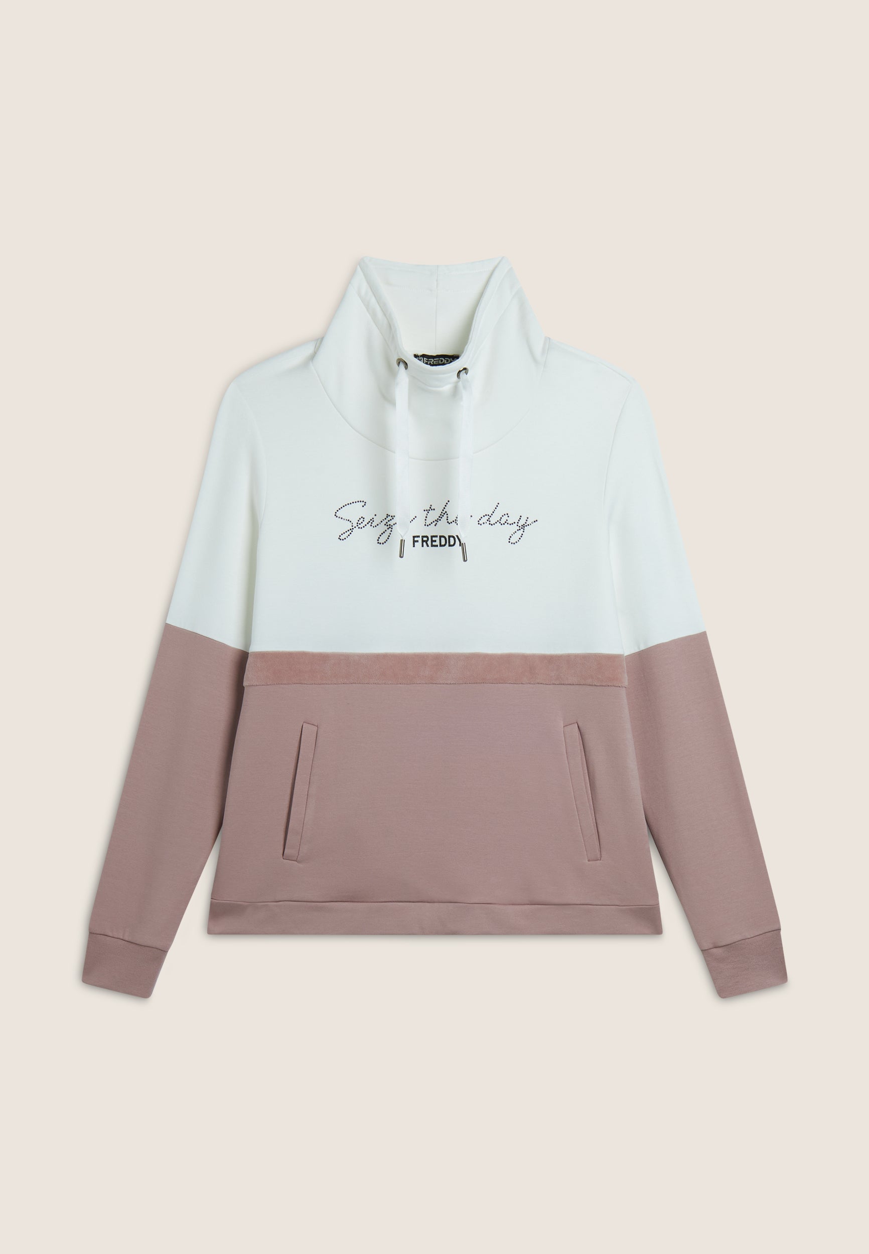 Geniesse die Weichheit und Flexibilität des Rollkragenpullovers aus angerautem Viskose-Sweatshirtstoff. Das Logo und der Strass-Schriftzug in der Mitte sorgen zusammen mit dem Samtband, welches das Kleidungsstück in der Mitte der Brust teilt, für einen Hauch von Eleganz. Die paspelierten Leistentaschen und der hohe Kragen mit Kordelzug sorgen für Funktionalität, während der längere, gerade Rückensaum mit seitlichen Öffnungen und die Rippbündchen für einen perfekten Sitz sorgen.