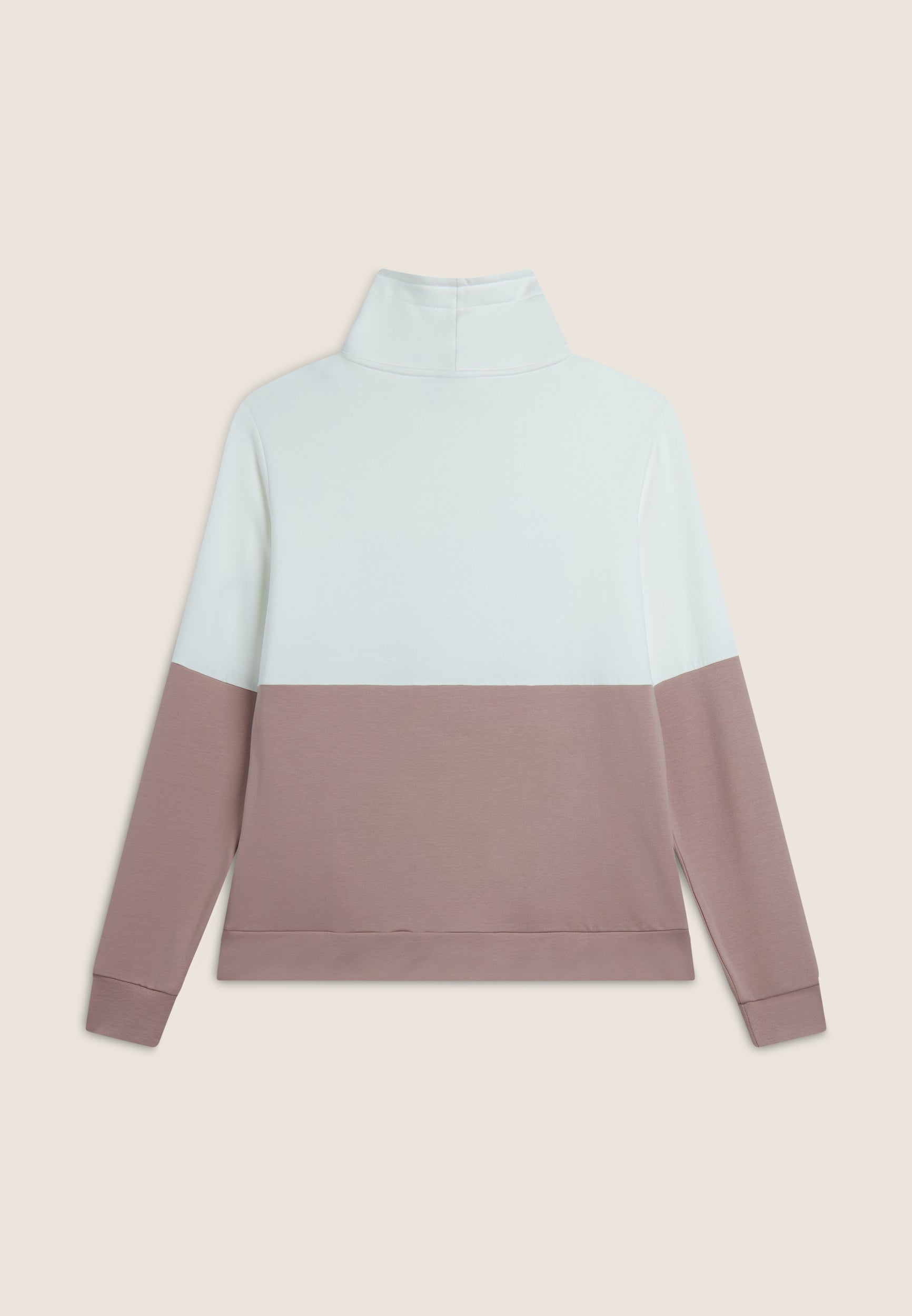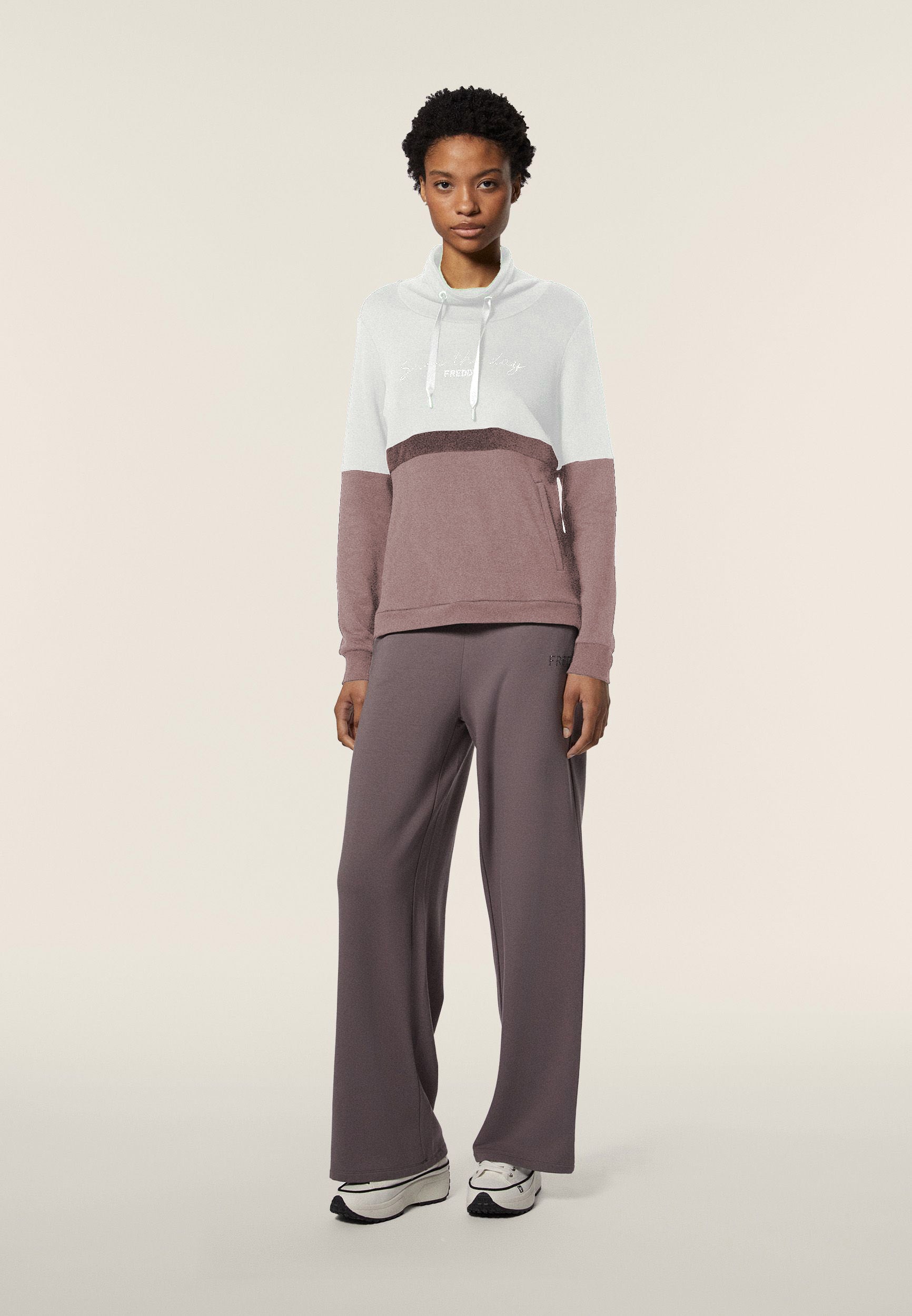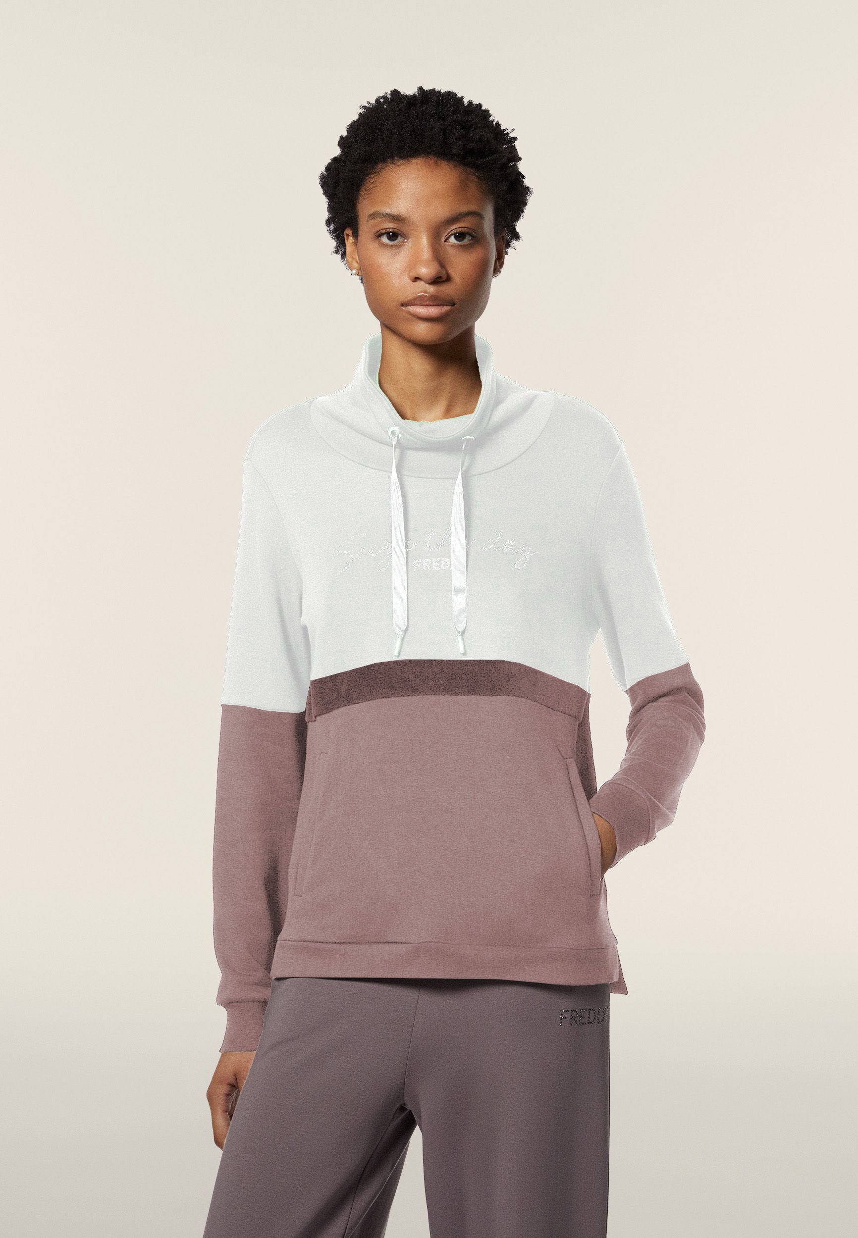 Geniesse die Weichheit und Flexibilität des Rollkragenpullovers aus angerautem Viskose-Sweatshirtstoff. Das Logo und der Strass-Schriftzug in der Mitte sorgen zusammen mit dem Samtband, welches das Kleidungsstück in der Mitte der Brust teilt, für einen Hauch von Eleganz. Die paspelierten Leistentaschen und der hohe Kragen mit Kordelzug sorgen für Funktionalität, während der längere, gerade Rückensaum mit seitlichen Öffnungen und die Rippbündchen für einen perfekten Sitz sorgen.