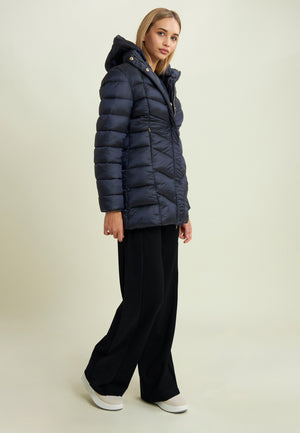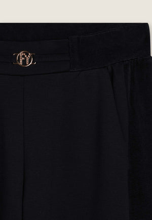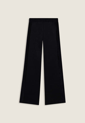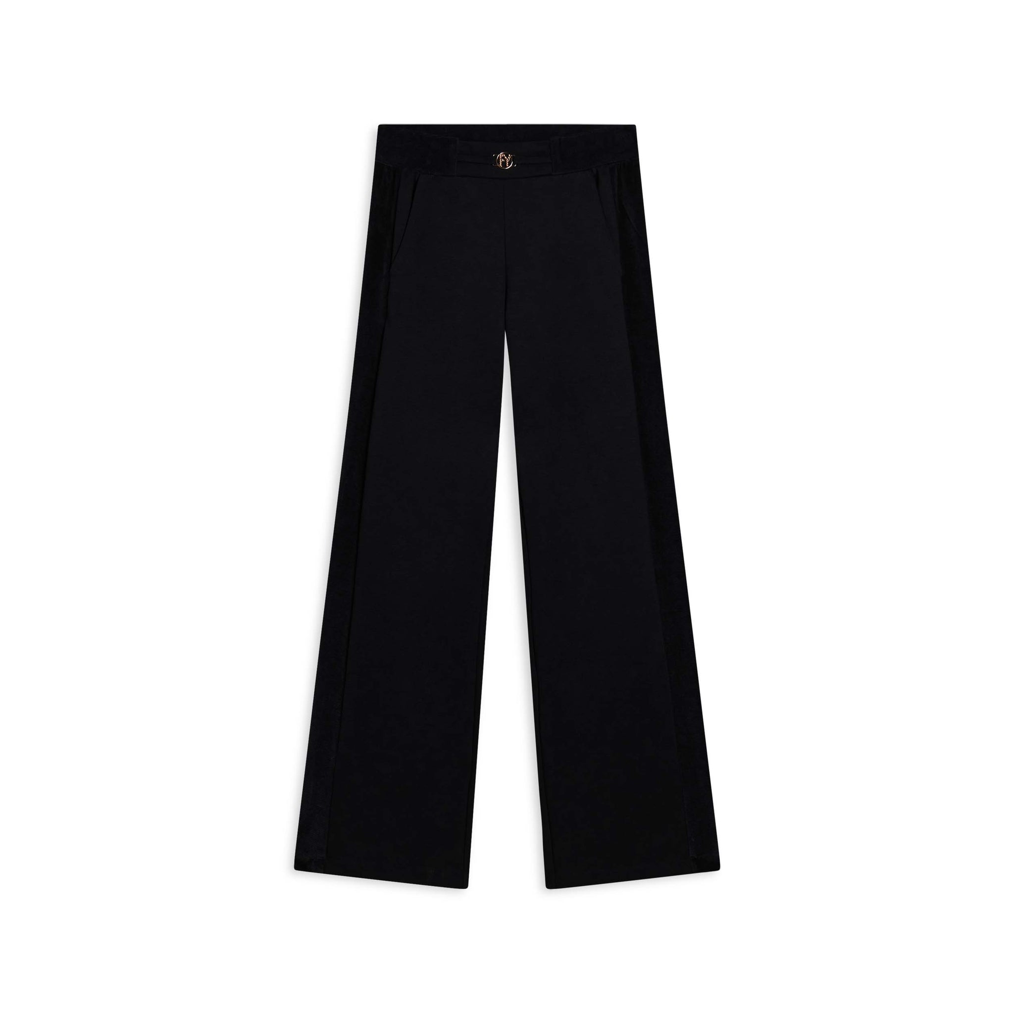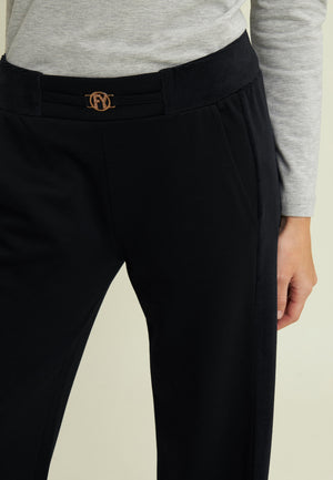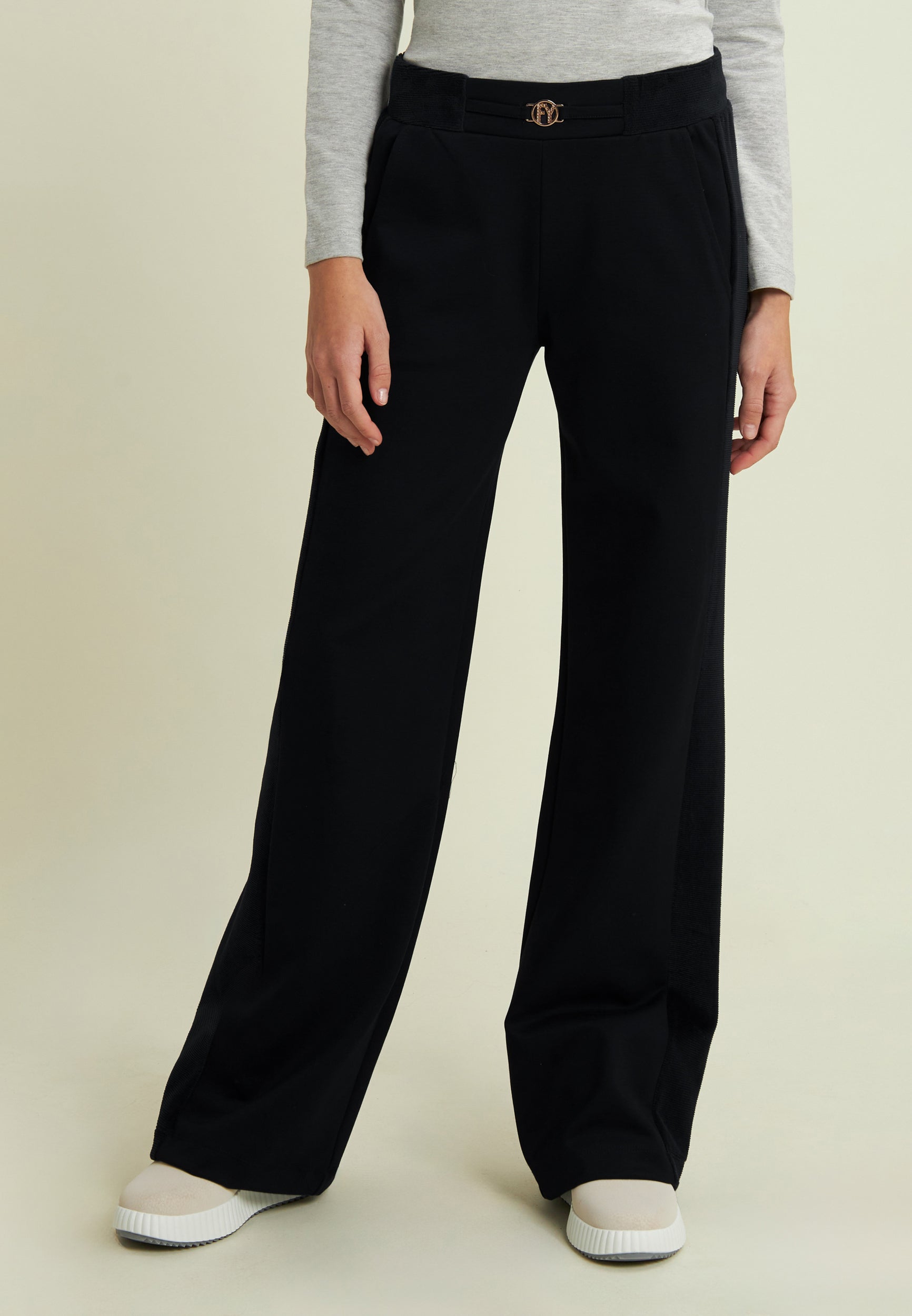 Weit geschnittene Damenhose aus Stretch-Viskose mit fliessendem und raffiniertem Schnitt. Der hohe Bund ist mit einem Chenille-Einsatz mit zentralem FY-Logo verziert, das sich auch an den Seiten der Beine wiederfindet. Die französischen Taschen vervollständigen das bequeme und feminine Design.